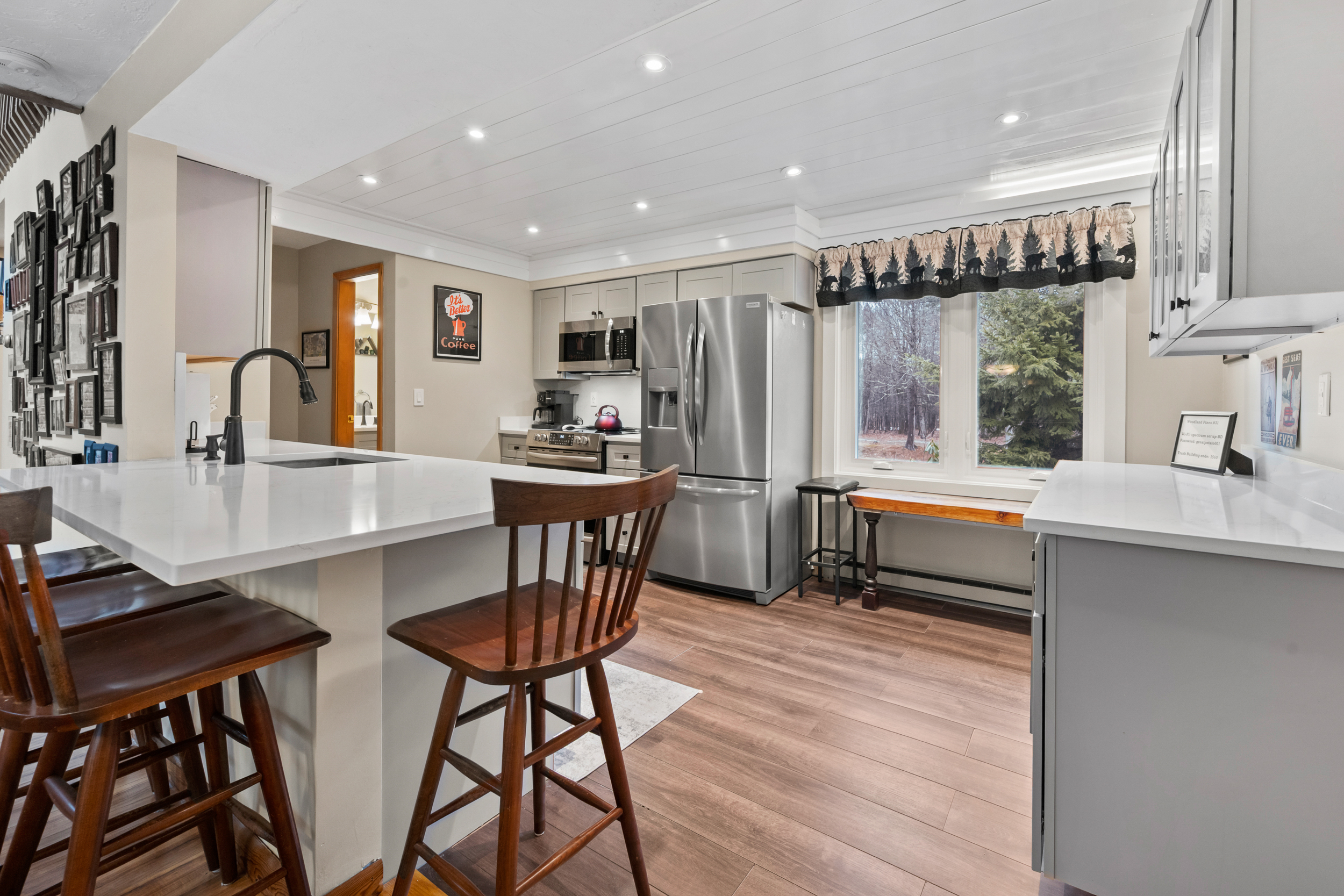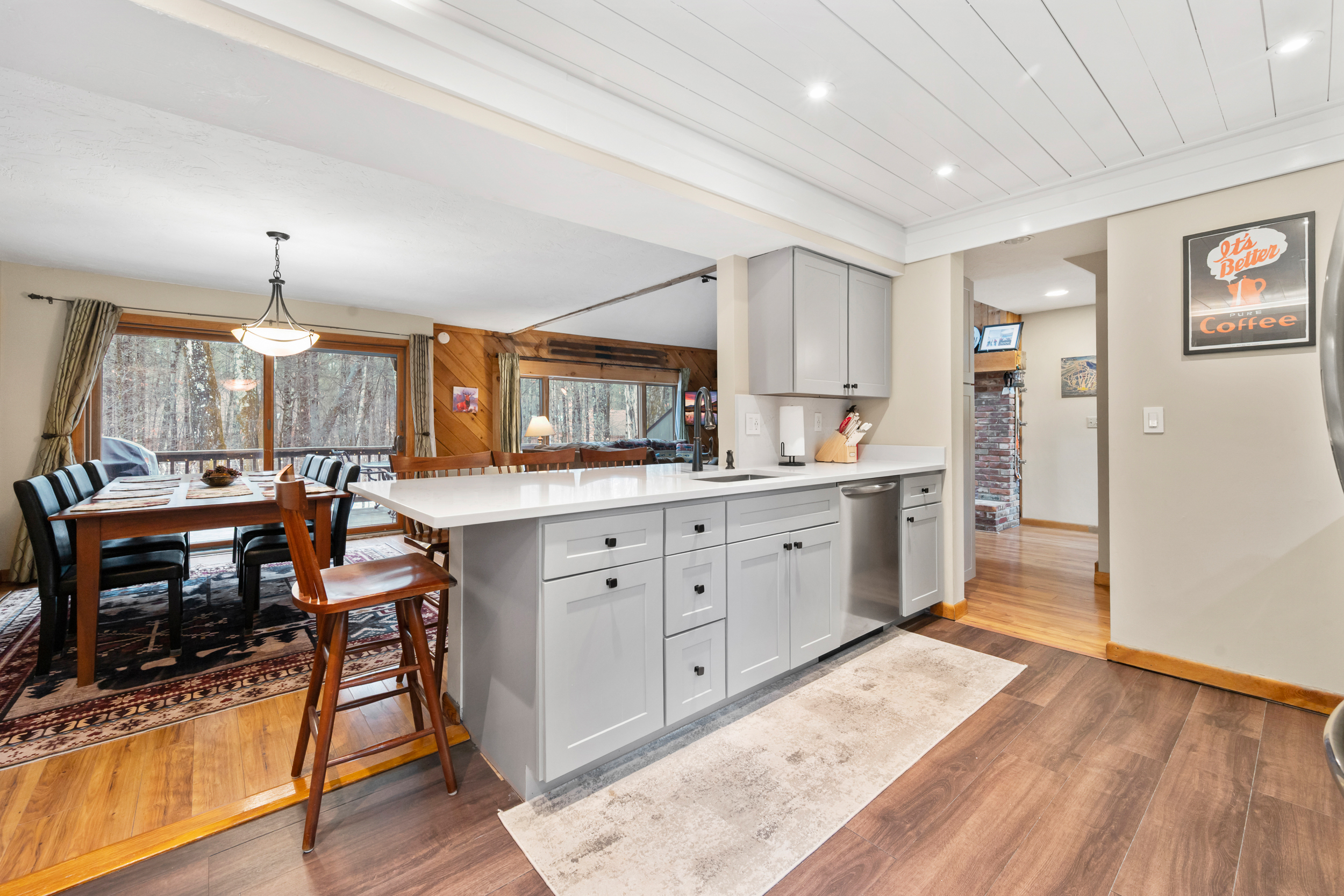 Pineside Hideaway is a renovated 3-bedroom, 2.5-bath condo in the Woodland Pines community in Bartlett, sleeping up to 12 across three levels including a loft. Enjoy a private deck, seasonal outdoor pool, and tennis courts in a quiet wooded setting just minutes from Attitash, Storyland, North Conway, and the White Mountains’ top attractions. A perfect four-season retreat for families and groups.
